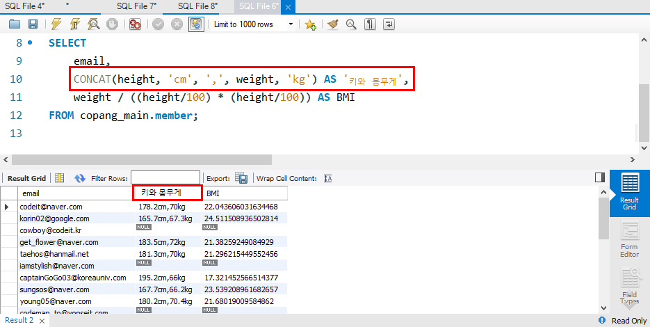 - BMI를 구하는 식이며 문장 뒤 AS를 써준 후 내가 붙이고자 하는 이름을 써준다 -> 컬럼에 그 이름이 들어가게 됨